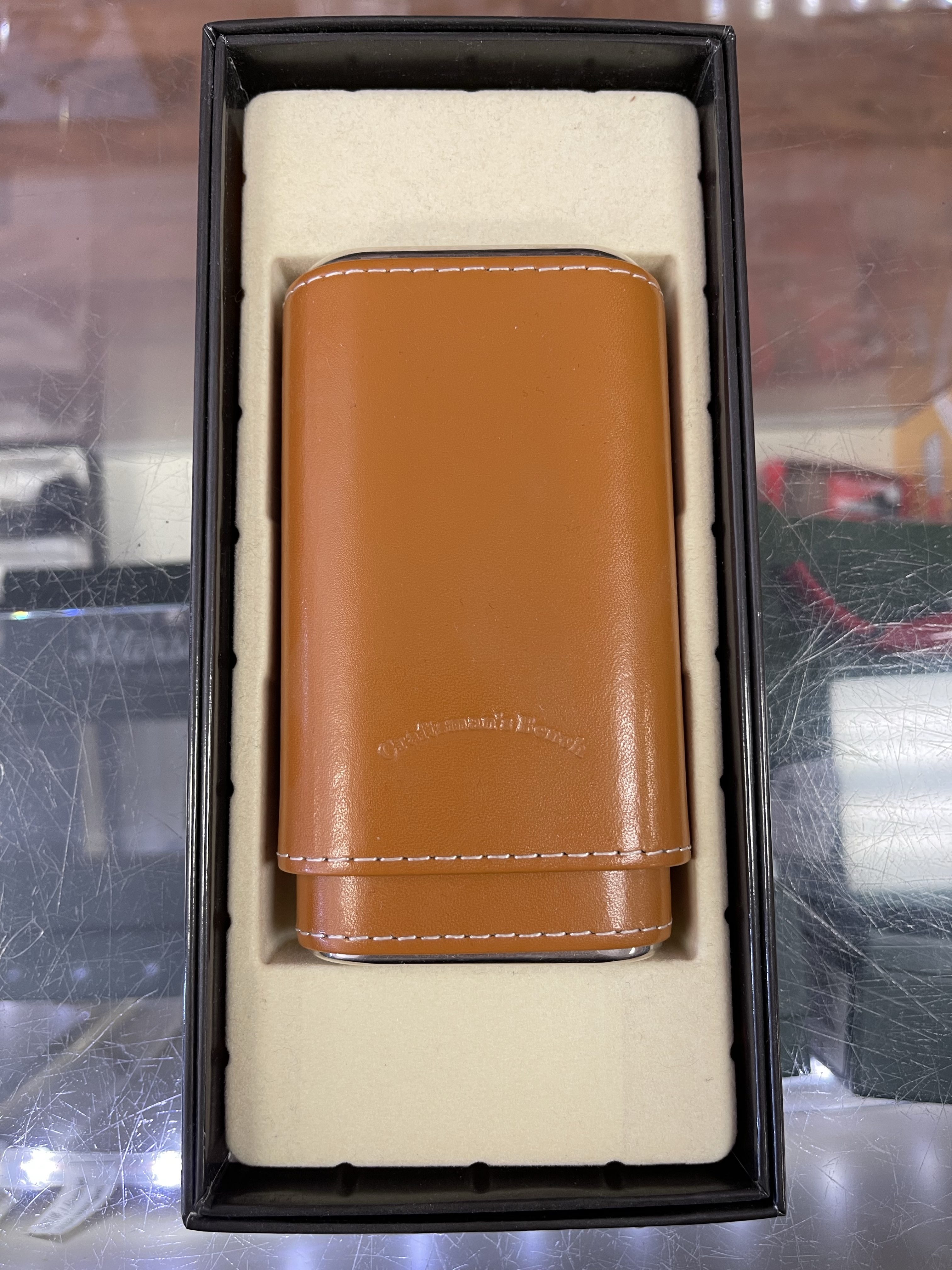 With their textured exterior and silver polished top and bottom, these leather cigar cases are perfect for the aficionado on the move. The durable material used to create these cases is wear-resistant and the cedar lining on the inside will keep your cigars fresh. Accommodates up to three 5 ½” x 54 ring gauge cigars.